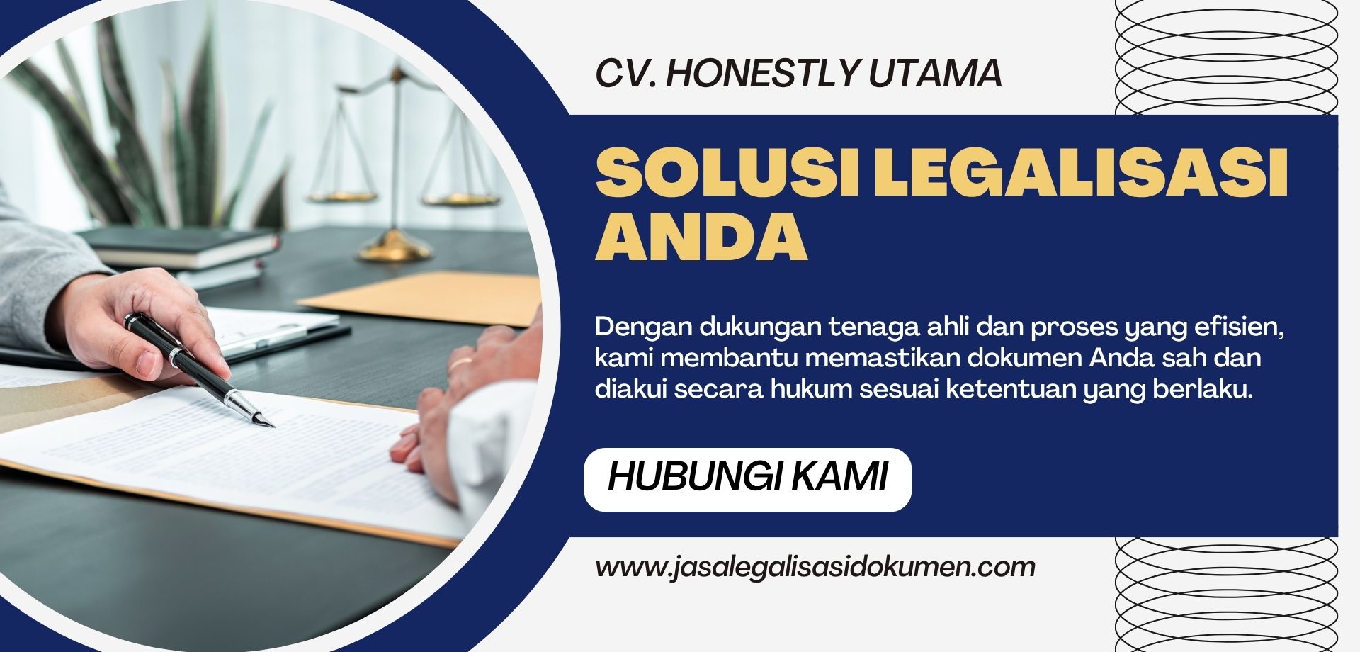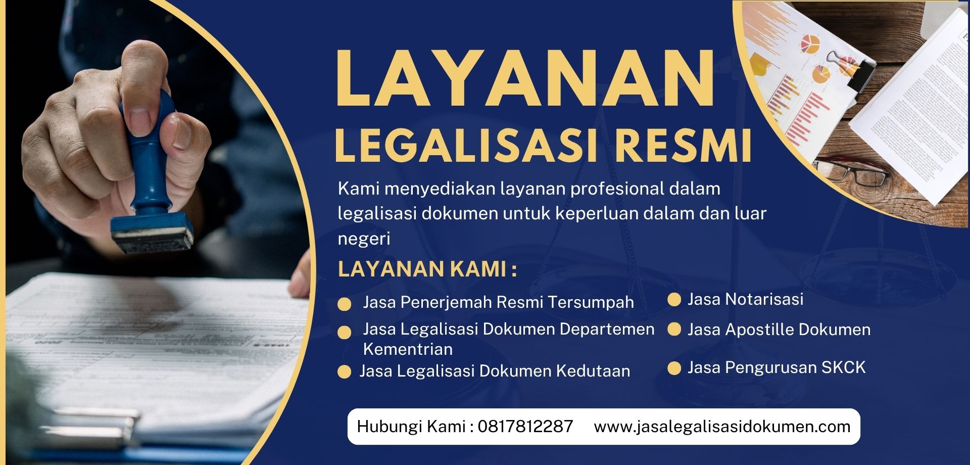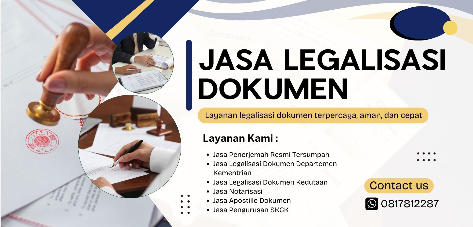 Kami adalah penyedia jasa legalisasi dokumen terpercaya yang melayani kebutuhan legalisasi dan keabsahan dokumen yang telah berdiri selama lebih dari 10 tahun untuk keperluan dalam dan luar negeri. Layanan kami mencakup terjemahan resmi (tersumpah), legalisasi di berbagai kementerian terkait, notarisasi, apostille, serta pengurusan SKCK. Dengan pengalaman dan profesionalisme, kami siap membantu proses dokumen Anda menjadi lebih mudah, cepat, dan tepat.